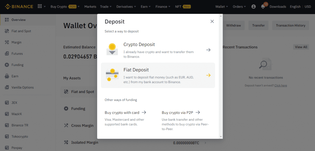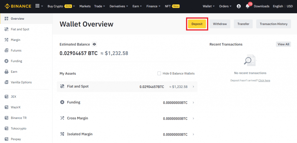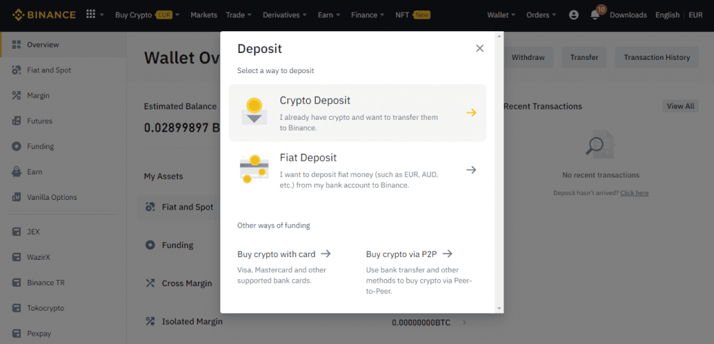 Din meniul de sus – dreapta, apasă pe „Wallet” și selectează „Overview”. De aici alege „Crypto Deposit”: