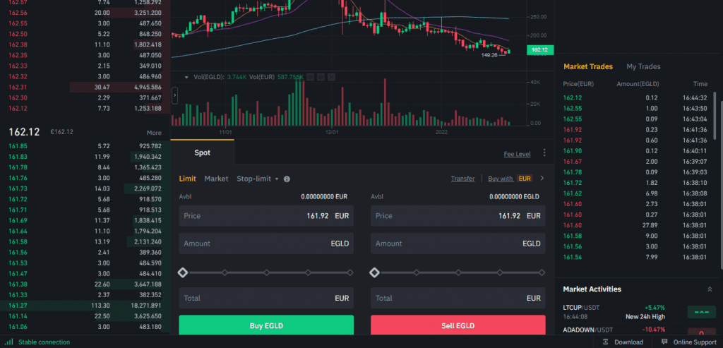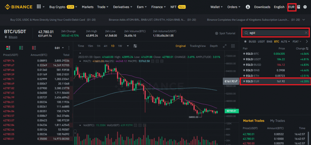 Din meniul din dreapta, unde scrie „Fiat” alege EUR, apoi optează pentru paritatea care te interesează – să zicem EGLD/EUR.