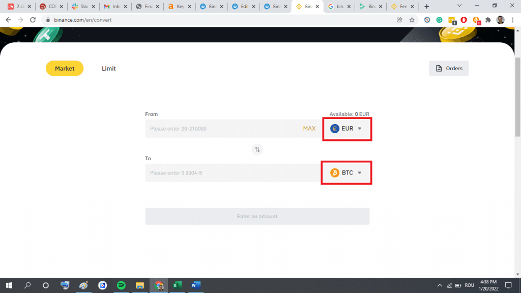 Din secțiunea „from”, alege din dreapta EUR, completează suma pe care vrei să o cheltui (pentru toată, apasă „MAX”) iar la „to” optează pentru crypto care te interesează.