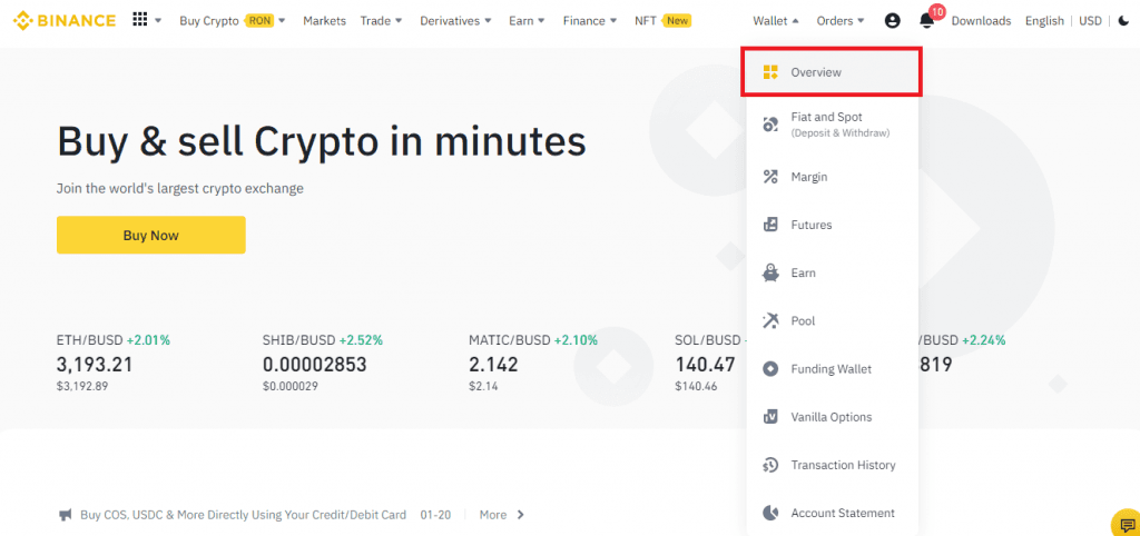 Din meniul de sus – dreapta, apasă pe „Wallet” și selectează „Overview”.