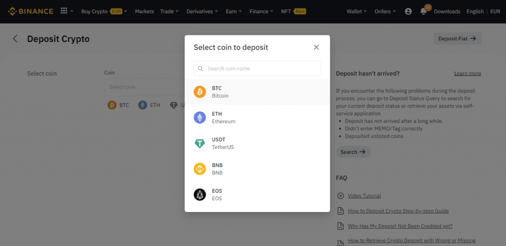 Alege apoi moneda pe care dorești să o transferi în portofelul oferit de cei de la Binance exchange: