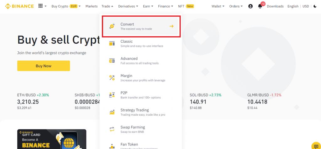 Dacă vrei să cumperi prima criptomonedă fără prea mari bătăi de cap, iată ce trebuie să faci: din meniul de sus, apasă „Trade” și apoi „Convert”.