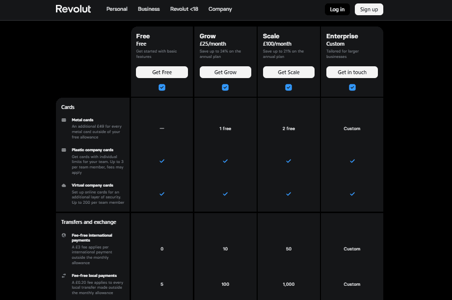 Revolut oferă cinci tipuri de conturi pentru persoane fizice: Standard, Plus, Premium, Metal și Ultra. Fiecare plan vine cu un abonament lunar diferit (exceptând Standard, care e gratuit) și beneficii pe măsură.