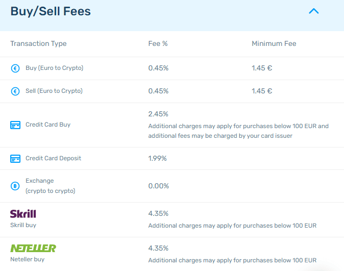 Atunci când vei vrea să tranzacționezi o criptomonedă va trebui să suporți un comision de 0.45 % per tranzacție (min. 1.45 Eur), atât la achiziționare, cât și la vânzare dacă banii vin sau ajung pe contul de pe aplicație.