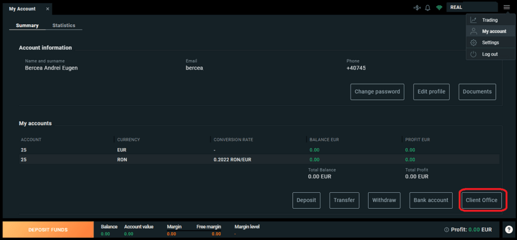 La deschiderea contului poți alege moneda pe care dorești ca acesta să o aibă ca referință: EUR sau RON în cazul în care utilizezi XTB România.
