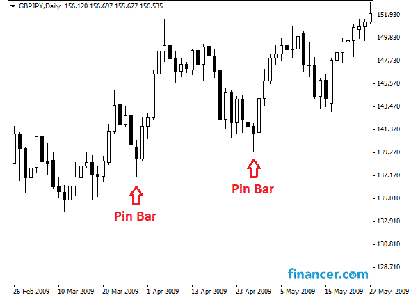 Iată și un exemplu concret, din piață. Dacă ne uităm la paritatea GBP/ JPY în perioada 26.02.2009 și 27.03.2009, putem observa două puncte de Pin Bar: primul la 137.17 și al doilea la 139.27.