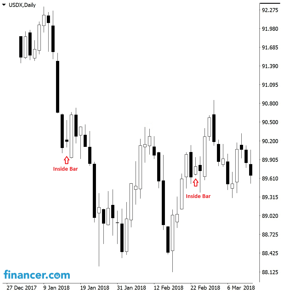 În reprezentarea grafică de mai sus poți vedea cum indicele USDX venea după un rally foarte puternic bearish în ianuarie - februarie 2018, când a format primul Inside Bar.